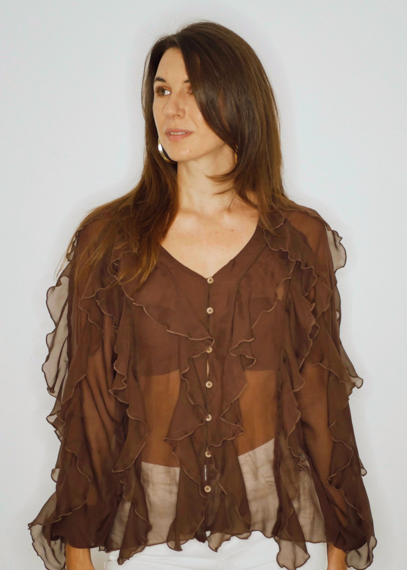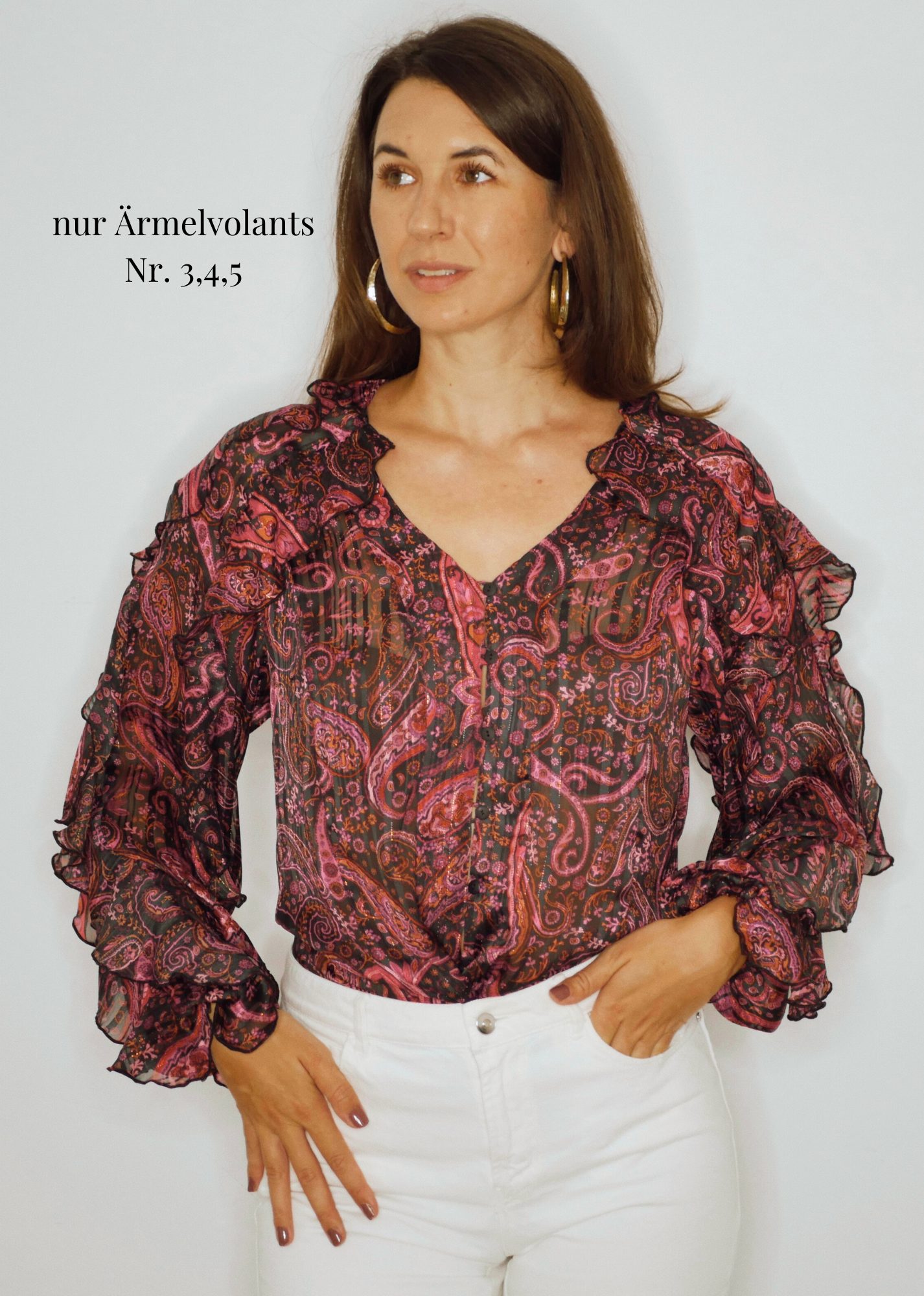 CARRIE ist eine luftige Bluse mit absolutem WOW-Effekt. Die bis zu 12 Volants – flexibel anpassbar – machen sie zum echten Hingucker in deinem Kleiderschrank. Im Vorderteil verlaufen zwei geschwungene Teilungsnähte pro Seite, im Rückenteil jeweils eine. Zwischen diesen Nähten werden die Volants eingesetzt. Die Bluse ist locker geschnitten, erhält aber durch leichte Taillierungen eine schöne Form, sodass die Volants nicht zu voluminös wirken.
